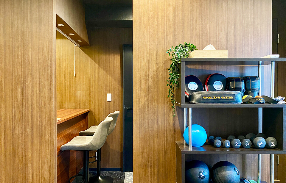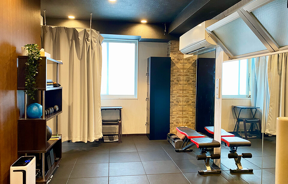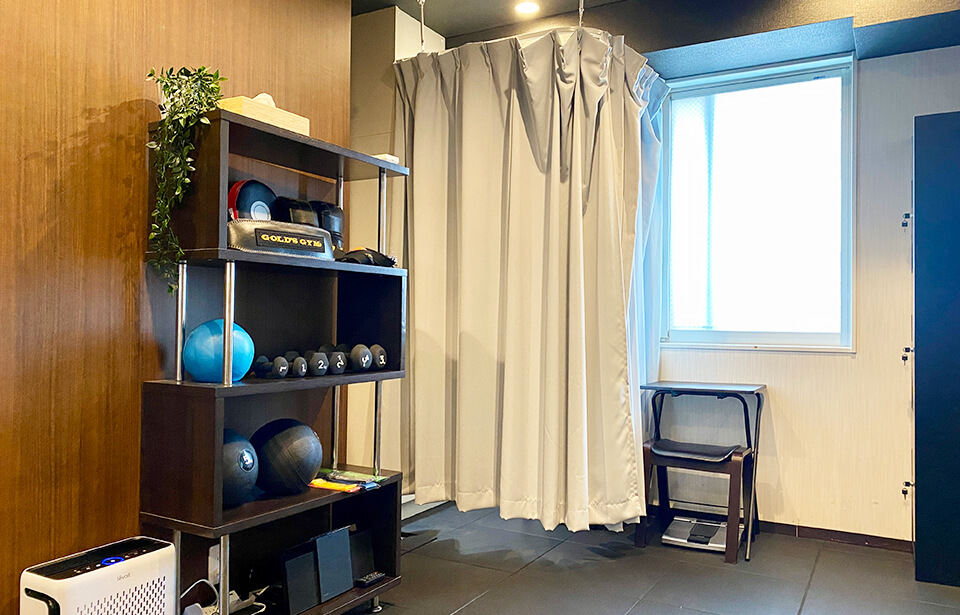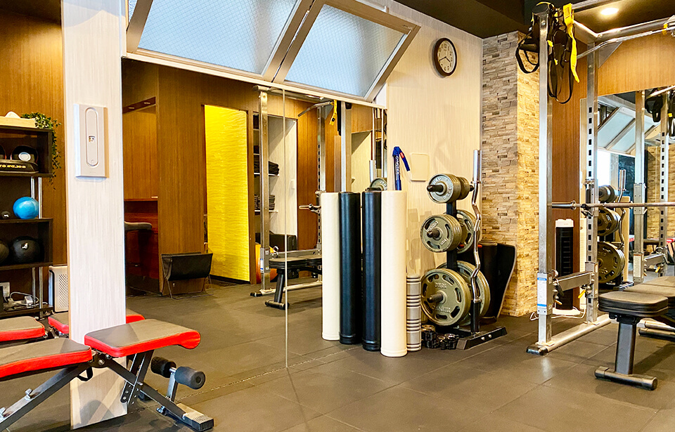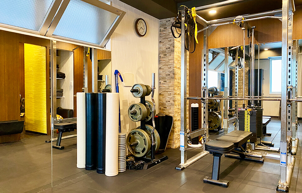 パワーラック(ラットオプション付)、プレート(1.25〜20kg×2)、可変式ダンベル(MAX22kgペア)、ダンベル(1〜3kgペア)、アジャスタブルベンチ、EZバー、バランスボール、ストレッチマット×2、ソフトギムニクボール、バランスディスク、ステップ台、ストレッチポール×1、グリッドローラー×1、施術ベッド、エクササイズバンド、フレックスクッション、血圧計、体組成計、空気清浄機